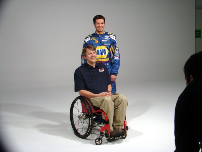 OK, here’s one for ya. Earlier this week, I was lucky enough to get selected to do a NASCAR PSA for PVA. Say that ten times fast. See what I mean? The Paralyzed Veterans of America (yes, you’ve heard of them and know how much they do for veterans like me in wheelchairs) was in town to shoot a public service announcement for a new campaign called “Mission: ABLE” (in a nutshell, it’s a partnership between PVA and NASCAR to help raise funds that will allow veterans to get better access to care, benefits and jobs) and they needed a veteran to participate in both the photo shoot as well as the video which will be televised during upcoming races. I happily agreed to participate.